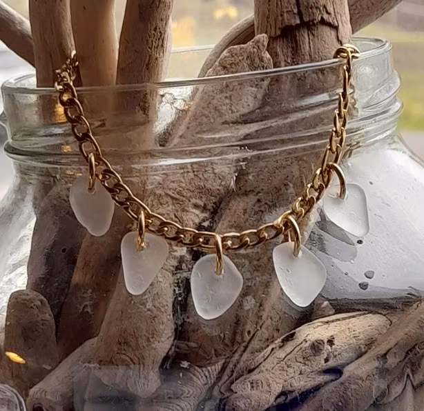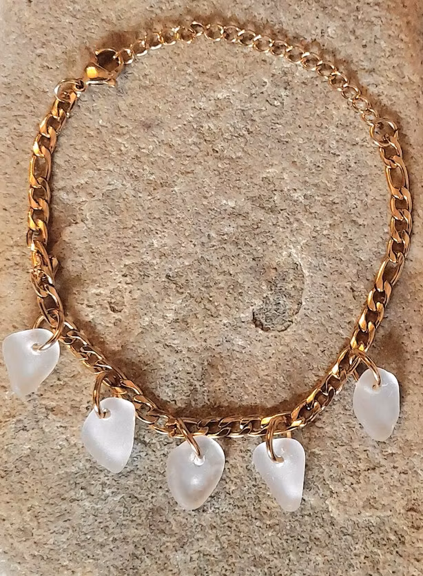 Armband av guldfärgat rostfritt stål med fem vita små strandglas.