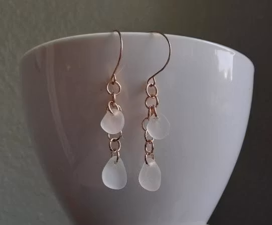Örhängen av roséguldfärgat rostfritt stål med dubbla vita strandglas.Krokarnas diameter 1,8 cm.Strandglasens storlek ca 1,2 cm X ca 1 cm..Total längd krokar + glas ca 6,5 cm.Finns endast i ett exemplar.