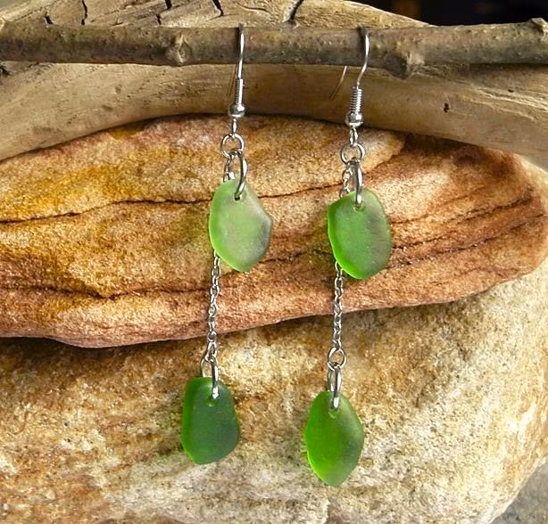 Örhängen med dubbla gröna strandglas. Krokar och kedjor av rostfritt stål.