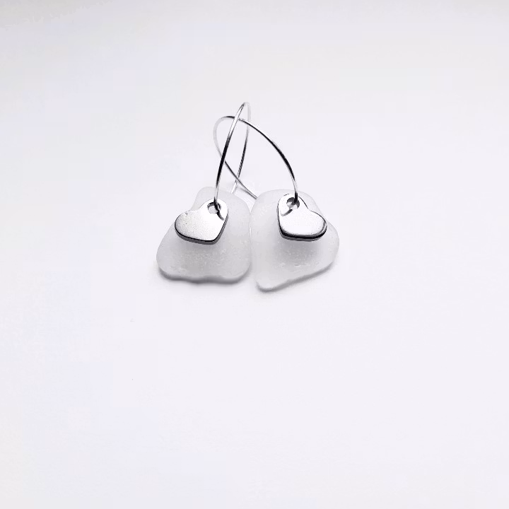 Creoler av 925 silver med vita strandglas och hjärtformade berlocker av silverfärgat rostfritt stål.