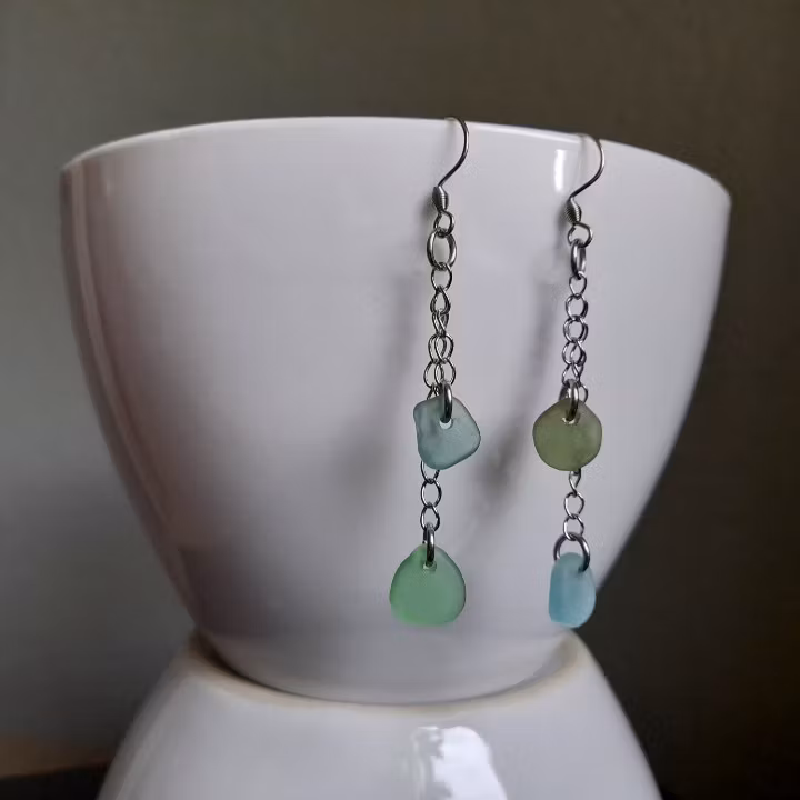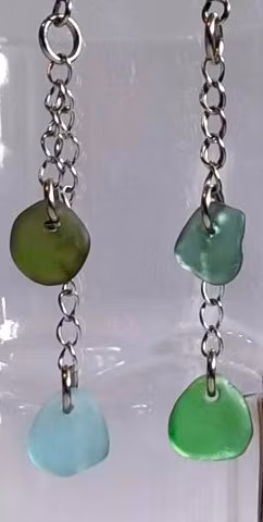 Örhängen med små gröna och blå strandglas. Krokar och kedjor av rostfritt stål.