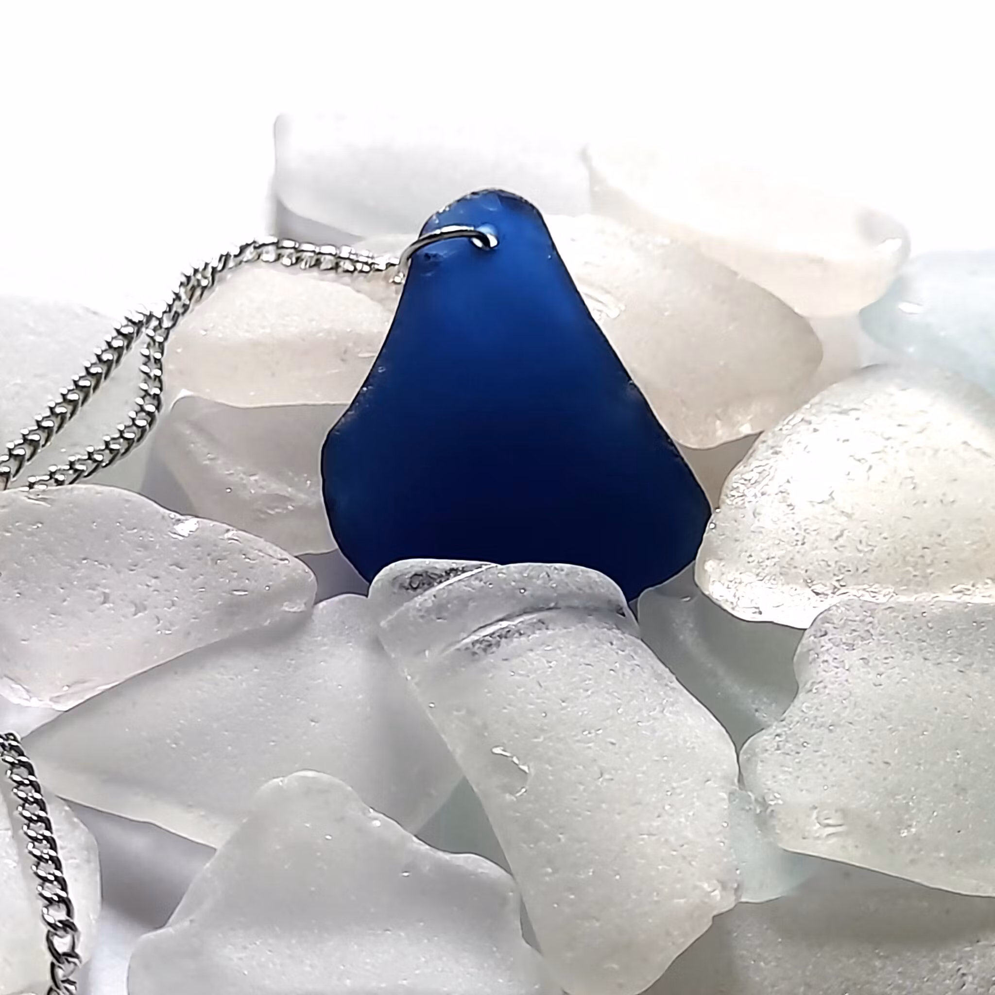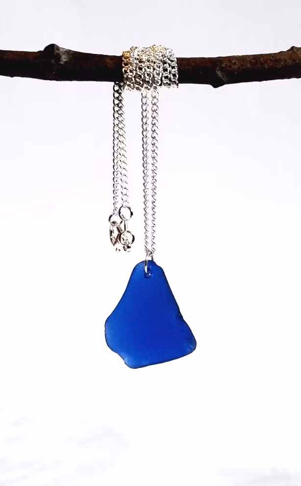 Koboltblått strandglas, silverpläterad kedja, bindring av 925 silver.