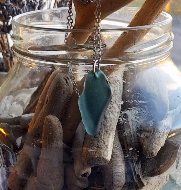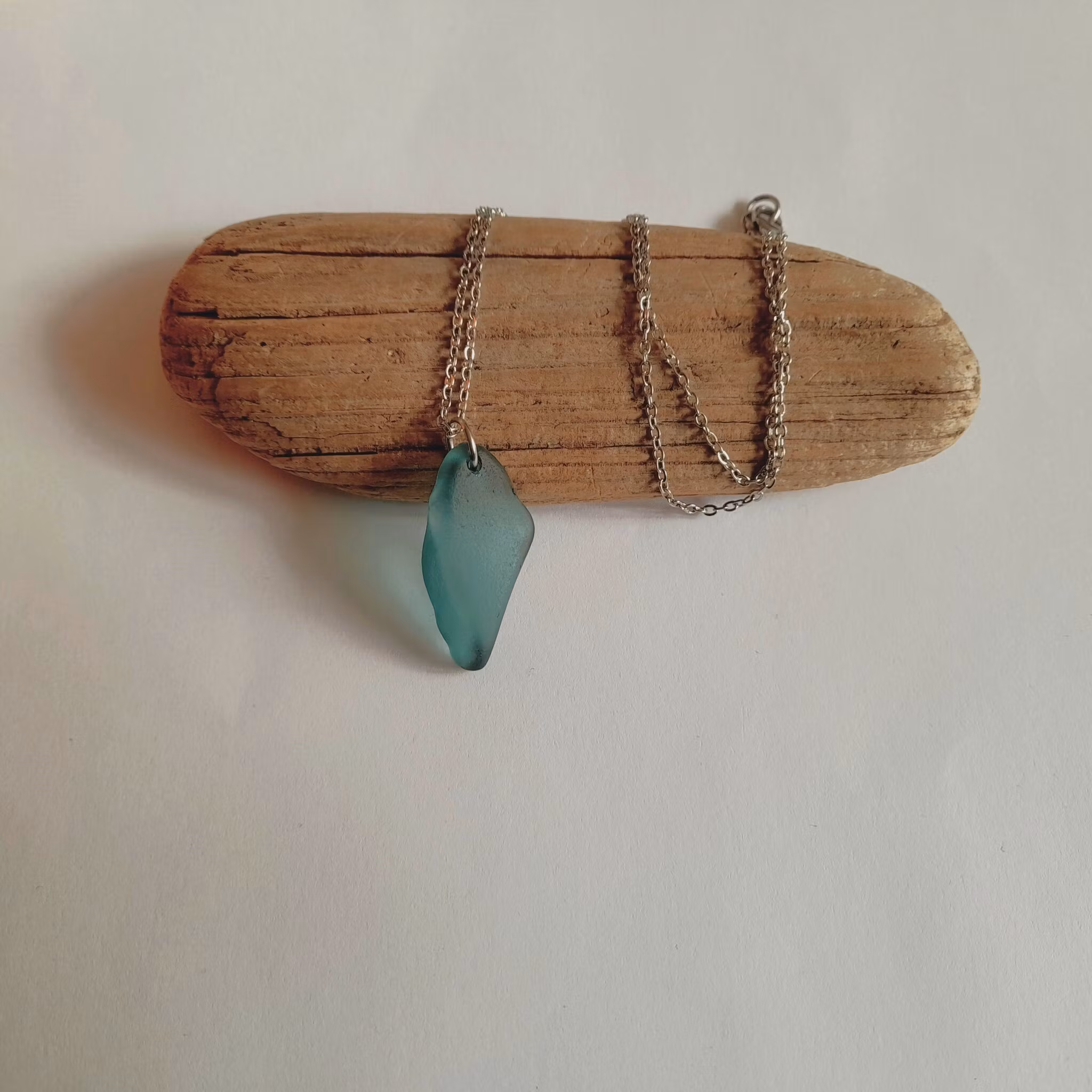 Halsband med blågrönt (teal) strandglas och kedja av rostfritt stål.