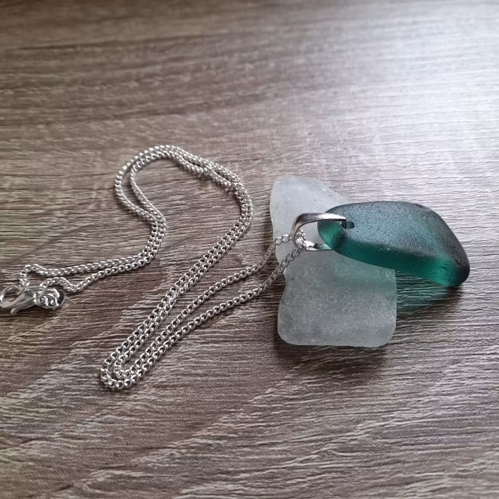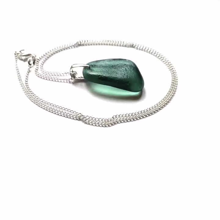 Vackert format strandglas i en originell blågrön färg med hänge (pinch bail) av 925 silver och silverpläterad kedja.