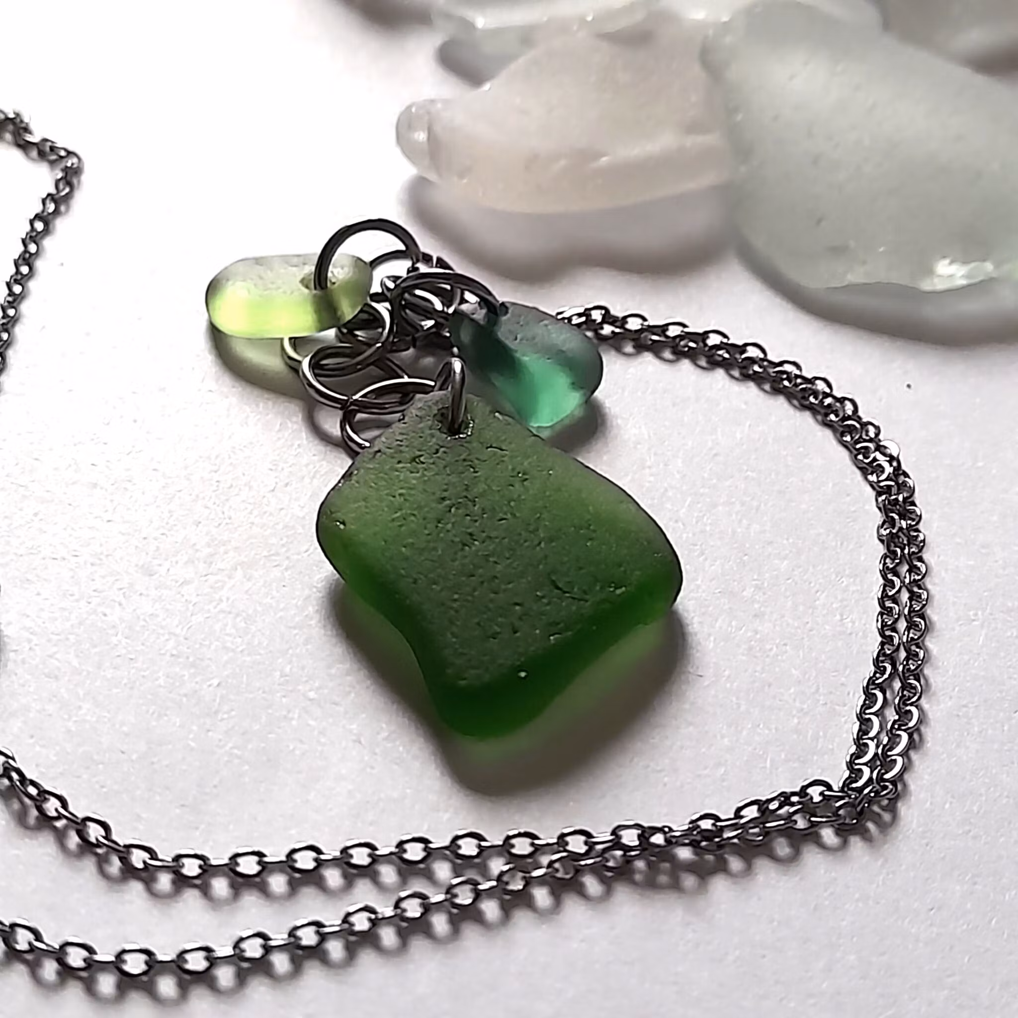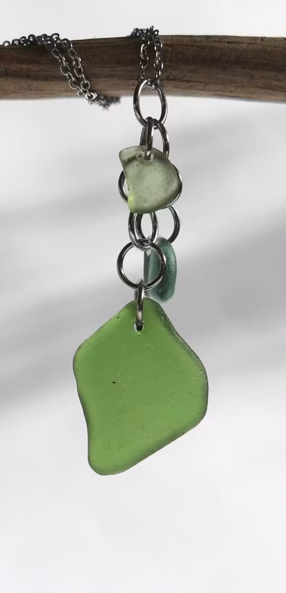 Tre gröna strandglas. Kedja och bindringar av rostfritt stål.
