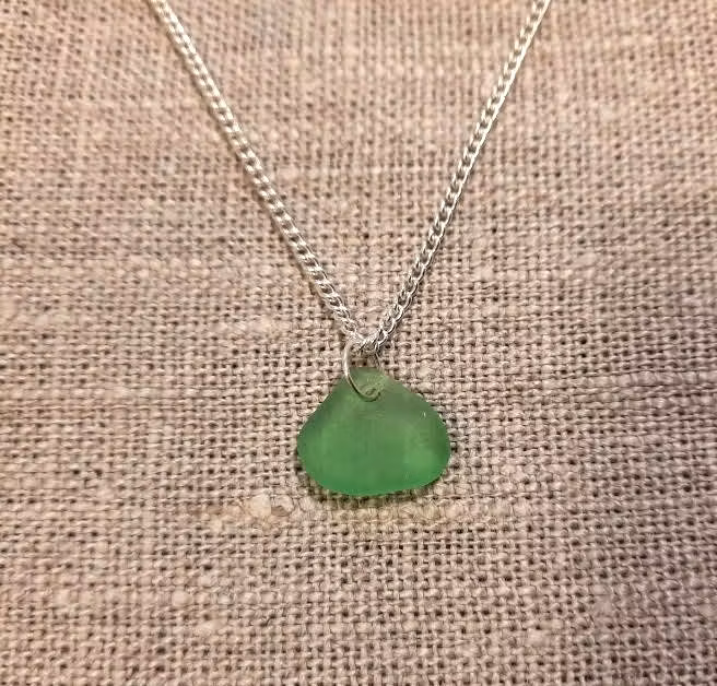 Vackert format litet strandglas i en härligt klargrön färg med bindringar av 925 silver och silverpläterad kedja.