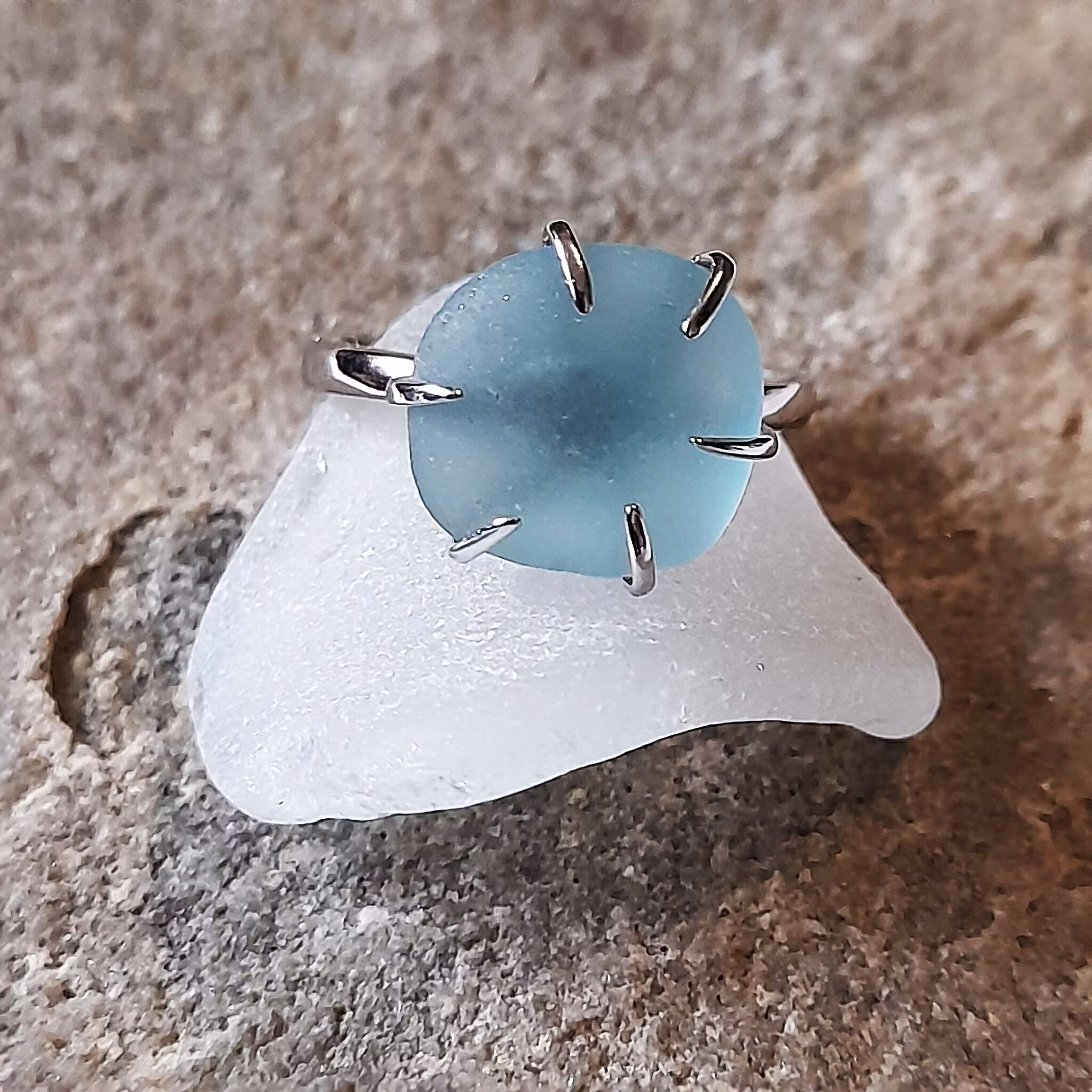 Ring av 925 silver med litet ljusblått strandglas.